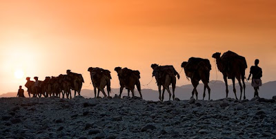 Doch noch immer wird das in der Danakil gewonnen Salz mit Karwanen auf die Märkte in Äthiopien transportiert und die Begegnung mit diesen Karawanen gehört zu den grossen und beeindruckenden Erlebnissen des modernen Menschen. Die ruhige Bewegung der Kamele, nur selten unterbrochen von den Rufen oder dem Gesang ihrer Treiber gehört zu den erhabensten Momenten, die man sich vorstellen kann. Man begegnet einer uralten Kultur, die sich bis in die Gegenwart erhalten hat. Es ist allerdings nicht zu erwarten, dass der Abbau der Salzes durch die Salzarbeiter in der Danakil und den Transport mit Karawanen noch lange so fortgeführt wird. Grosse Konzerne bauen die Strasse von Bir Aile nach Amadela massiv aus und Lastwagen transportieren mehr und mehr Maschinen und Waren für die Versorgung der Konzernarbeiter bis in die Ebene der Danakil-Wüste. Es ist zu befürchten, dass der einzigartige Anblick der Karawanen bald nur noch Erinnerung sein wird. Zur Bildgalerie >